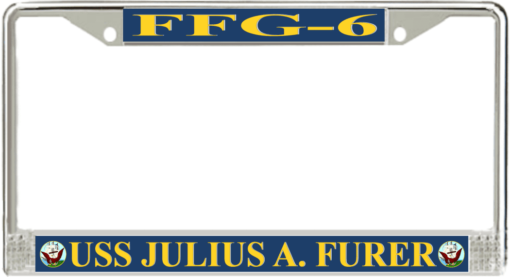 USS Julius A. Furer FFG-6 License Plate FrameThis USS Julius A. Furer FFG-6 License Plate Frame is proudly made in the USA at our facilities in Scottsboro, Alabama. Each of our MilitaryBest U.S. Navy Frames feature top and bottom Poly Coated Aluminum strips that are printed using sublimation which gives these quality automobile military frames a beautiful high gloss finish.