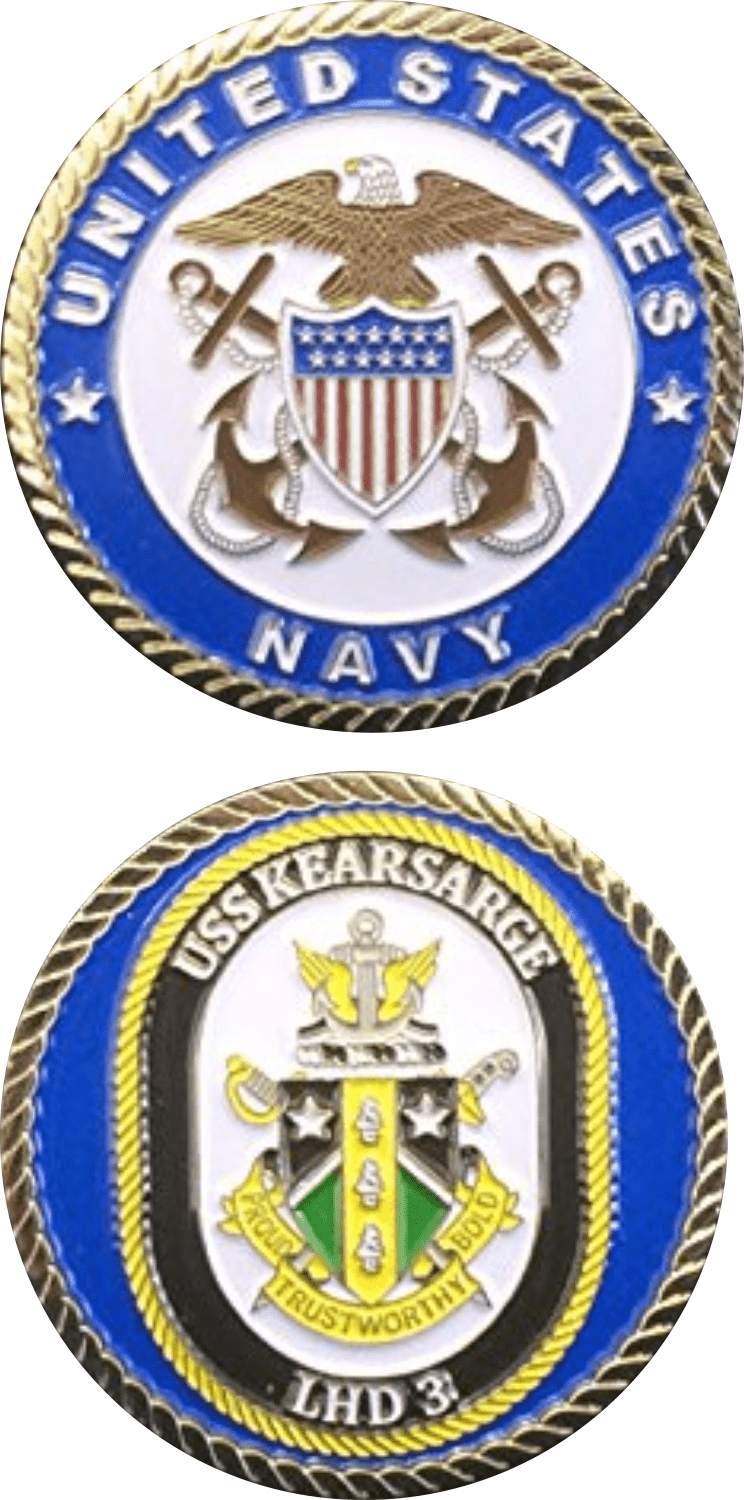 This USS Kearsarge LHD 3 Challenge Coin measures 1.75" and is made from a brass alloy nickel finish. Each coin is individually hand painted and officially licensed by the U.S. Navy. This challenge coin would make a wonderful addition to your collection or a great gift. Its quality is guaranteed.Does NOT Fit in Acrylic Single 1 5/8" Challenge Coin Display Case