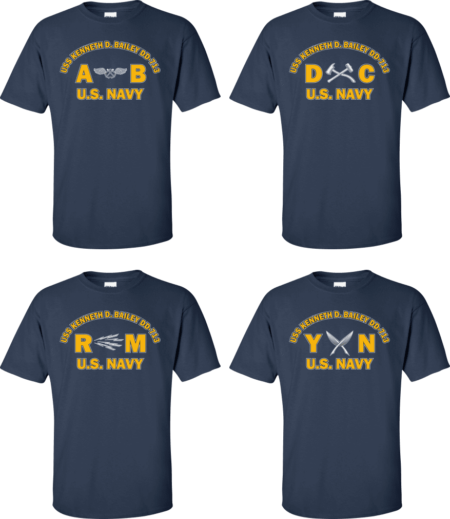 Due to disruptions in supply chains, this design will be embroidered on a Champion, Gildan, Jerzees or comparable brand.Proudly display your ship and rate with our top quality USS KENNETH D. BAILEY DD-713 Rates t-shirts, sweatshirts, and hoodies. These fine U.S. Navy apparel items will make you the envy of your veteran buddies, or will make a fine gift! Our USS KENNETH D. BAILEY DD-713 shirts are proudly printed in the USA!