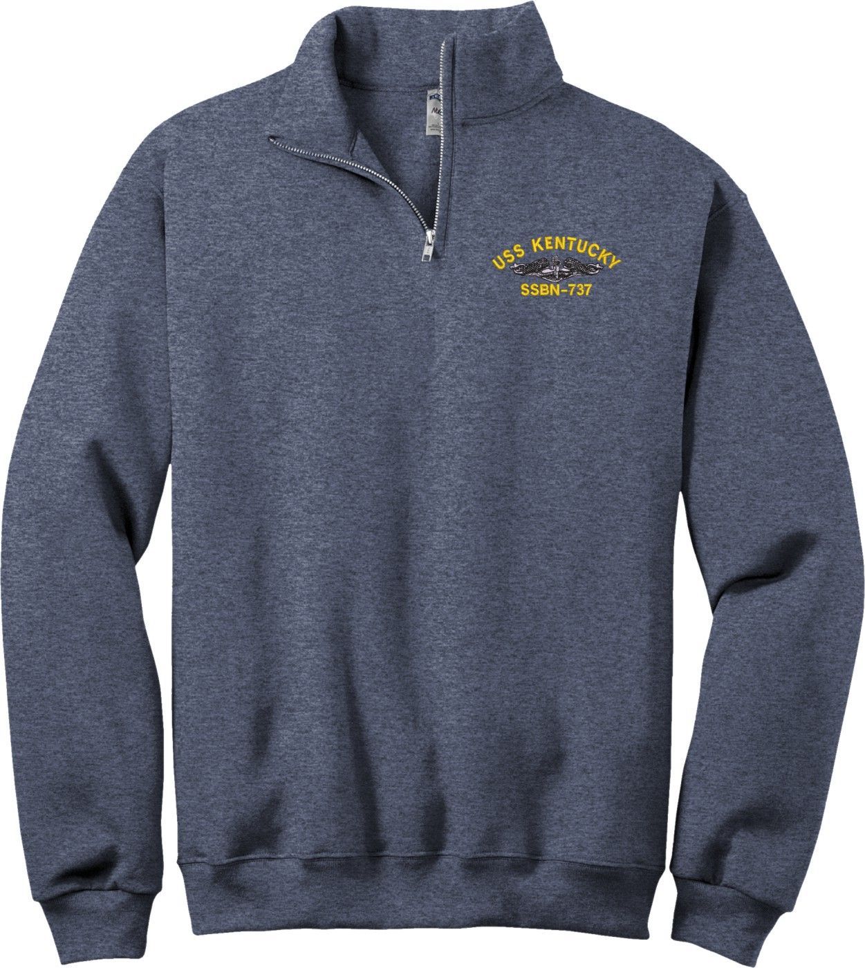 This USS Kentucky SSBN-737 w/ Silver Dolphins Heather Navy Quarter-Zip Pullover Medium is an overstock item and is only available for the value price while supplies last. Clearance Items are not eligible for Refunds or Returns,A percentage of the sale of each MilitaryBest item is forwarded to the licensing departments of each respective branch of service in support of the MWR (Morale, Welfare, & Recreation) program. These payments are made by either ALL4U LLC or the wholesaler from where the item originated. Our team thanks you for your service and your support of these programs.