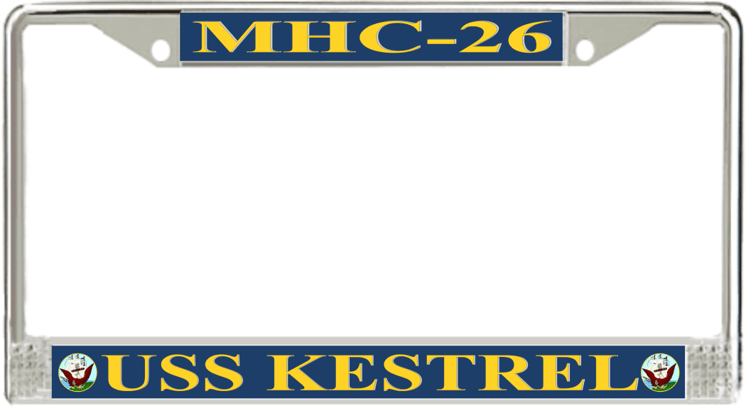 USS Kestrel MHC-26 License Plate FrameThis USS Kestrel MHC-26 License Plate Frame is proudly made in the USA at our facilities in Scottsboro, Alabama. Each of our MilitaryBest U.S. Navy Frames feature top and bottom Poly Coated Aluminum strips that are printed using sublimation which gives these quality automobile military frames a beautiful high gloss finish.