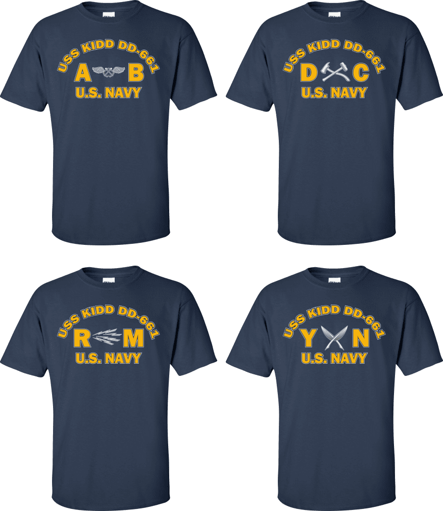 Due to disruptions in supply chains, this design will be embroidered on a Champion, Gildan, Jerzees or comparable brand.Proudly display your ship and rate with our top quality USS KIDD DD-661 Rates t-shirts, sweatshirts, and hoodies. These fine U.S. Navy apparel items will make you the envy of your veteran buddies, or will make a fine gift! Our USS KIDD DD-661 shirts are proudly printed in the USA!