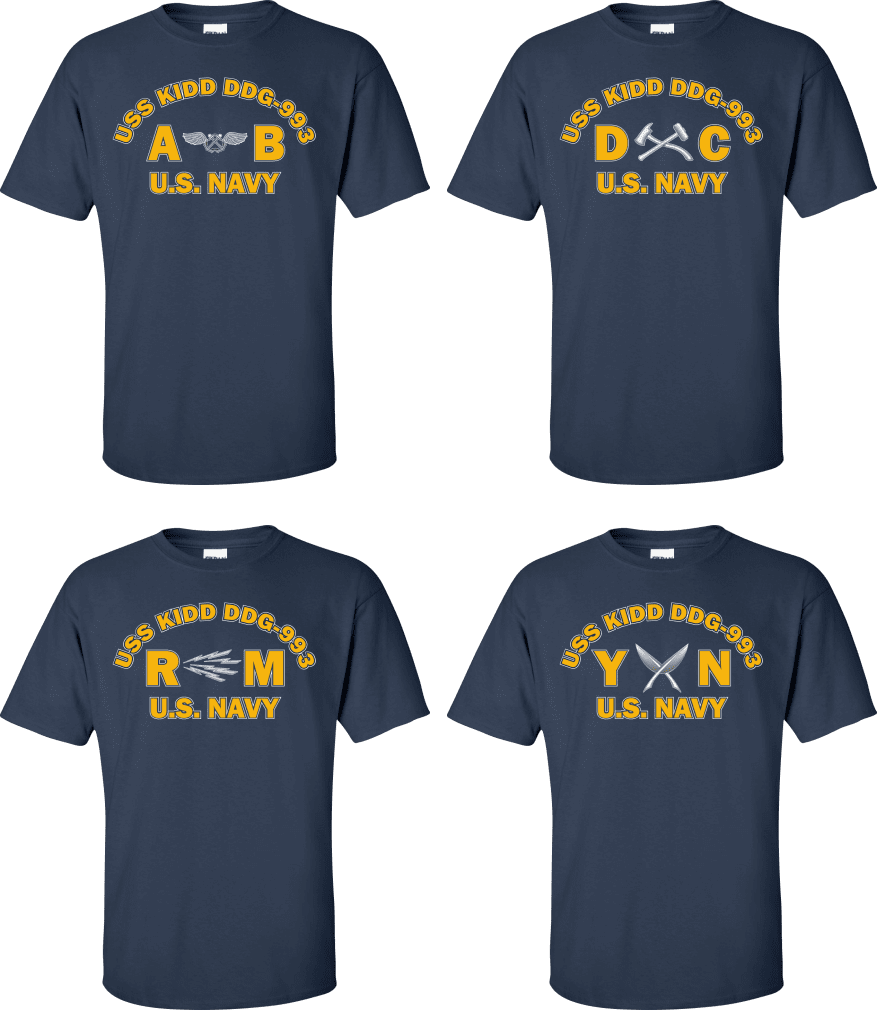 Due to disruptions in supply chains, this design will be embroidered on a Champion, Gildan, Jerzees or comparable brand.Proudly display your ship and rate with our top quality USS KIDD DDG-993 Rates t-shirts, sweatshirts, and hoodies. These fine U.S. Navy apparel items will make you the envy of your veteran buddies, or will make a fine gift! Our USS KIDD DDG-993 shirts are proudly printed in the USA!