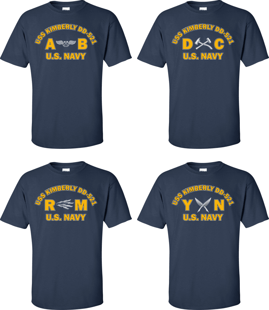 Due to disruptions in supply chains, this design will be embroidered on a Champion, Gildan, Jerzees or comparable brand.Proudly display your ship and rate with our top quality USS KIMBERLY DD-521 Rates t-shirts, sweatshirts, and hoodies. These fine U.S. Navy apparel items will make you the envy of your veteran buddies, or will make a fine gift! Our USS KIMBERLY DD-521 shirts are proudly printed in the USA!