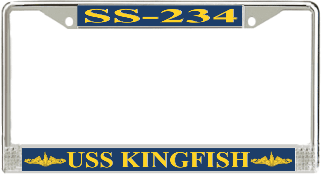 USS Kingfish SS-234 License Plate Frame This USS Kingfish SS-234 License Plate Frame is proudly made in the USA at our facilities in Scottsboro, Alabama. Each Frame features top and bottom sublimated design strips that are poly coated for a protective gloss finish. Please check your state and local regulations for compatibility of these frames for use on your vehicle.