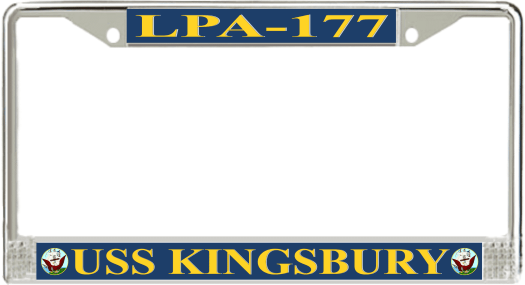 USS Kingsbury LPA-177 License Plate frameThis USS Kingsbury LPA-177 License Plate frame is proudly made in the USA at our facilities in Scottsboro, Alabama. Each of our MilitaryBest U.S. Navy Frames feature top and bottom Poly Coated Aluminum strips that are printed using sublimation which gives these quality automobile military frames a beautiful high gloss finish.