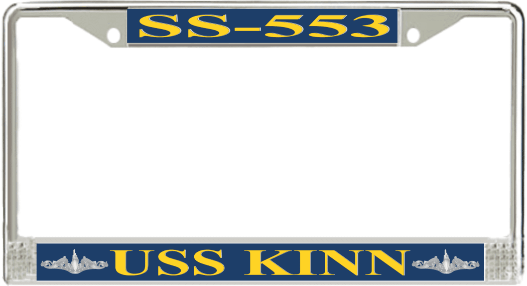 USS Kinn SS-553 License Plate Frame This USS Kinn SS-553 License Plate Frame is proudly made in the USA at our facilities in Scottsboro, Alabama. Each Frame features top and bottom sublimated design strips that are poly coated for a protective gloss finish. Please check your state and local regulations for compatibility of these frames for use on your vehicle.
