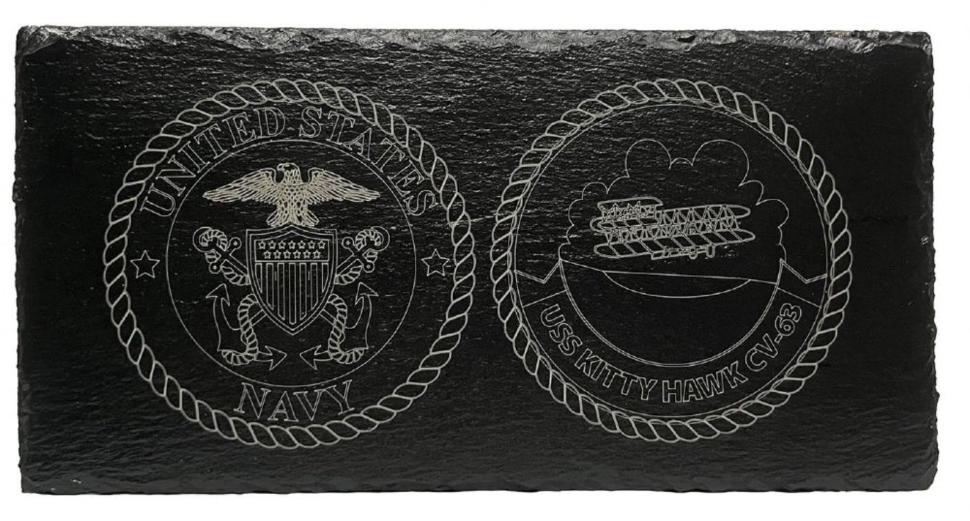 We are proud to offer this laser engraved slate plaque. This USS Kitty Hawk CV-63 Officer Plaque is engraved on a 12 x 6 inch piece of slate that offers a rustic and classic way to display on your desktop or book shelf. All plaques come with a black metal three leg stand. This plaque is Offically Licensed product by the Navy and made in the USA.