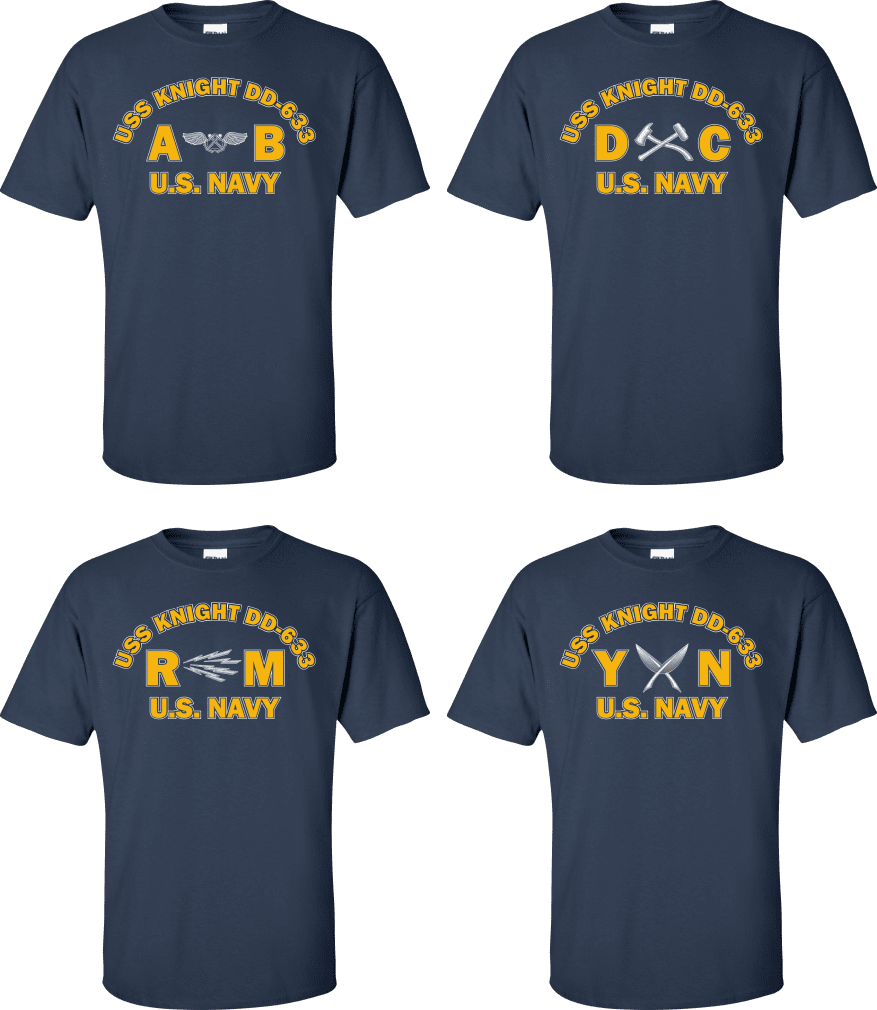 Due to disruptions in supply chains, this design will be embroidered on a Champion, Gildan, Jerzees or comparable brand.Proudly display your ship and rate with our top quality USS KNIGHT DD-633 Rates t-shirts, sweatshirts, and hoodies. These fine U.S. Navy apparel items will make you the envy of your veteran buddies, or will make a fine gift! Our USS KNIGHT DD-633 shirts are proudly printed in the USA!