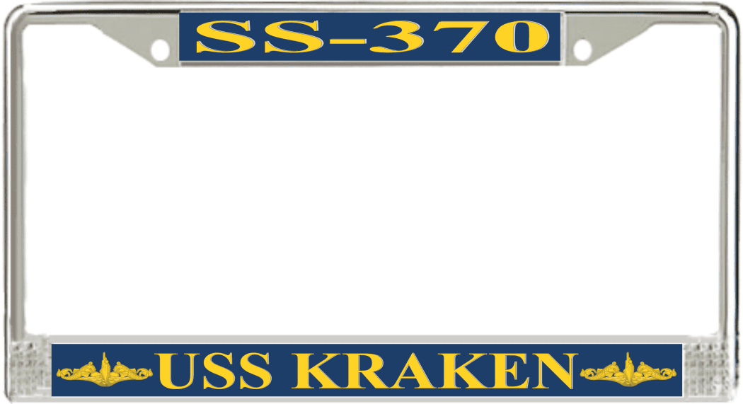 USS Kraken SS-370 License Plate Frame This USS Kraken SS-370 License Plate Frame is proudly made in the USA at our facilities in Scottsboro, Alabama. Each Frame features top and bottom sublimated design strips that are poly coated for a protective gloss finish. Please check your state and local regulations for compatibility of these frames for use on your vehicle.