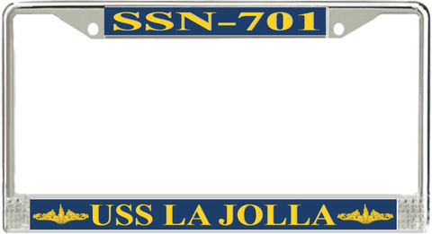 USS La Jolla SSN-701 License Plate Frame This USS La Jolla SSN-701 License Plate Frame is proudly made in the USA at our facilities in Scottsboro, Alabama. Each Frame features top and bottom sublimated design strips that are poly coated for a protective gloss finish. Please check your state and local regulations for compatibility of these frames for use on your vehicle.