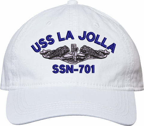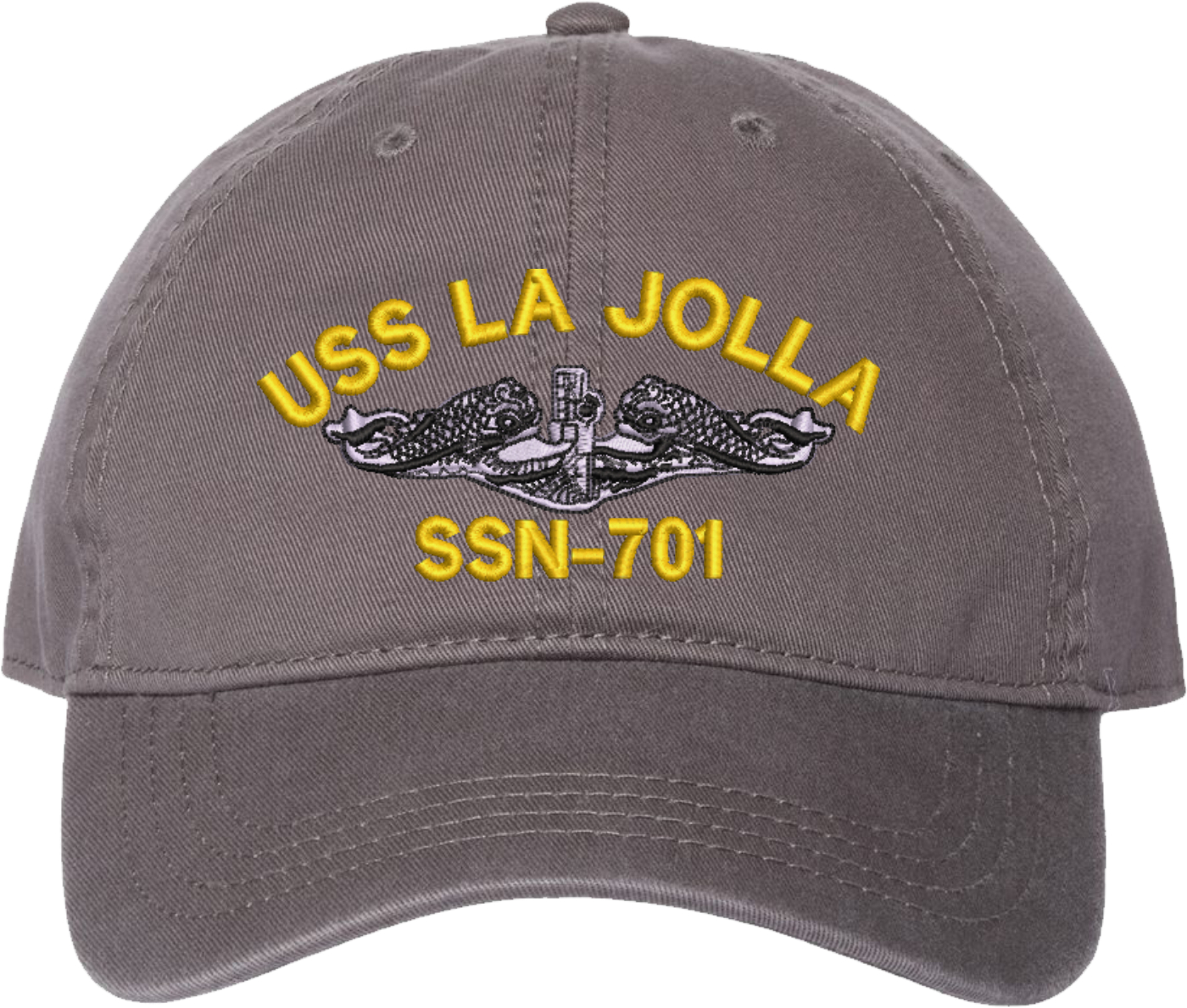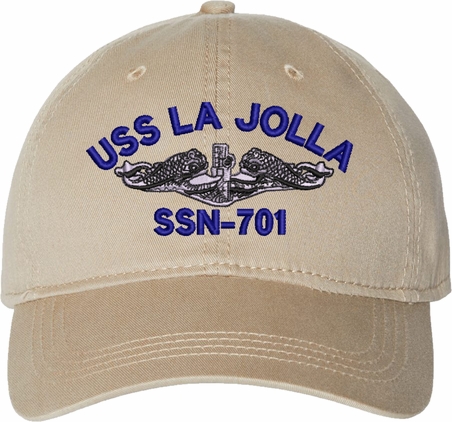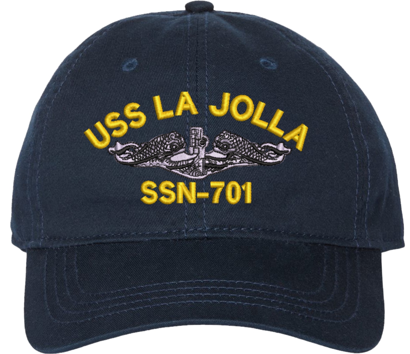 Show your Navy pride with this USS La Jolla SSN-701 with Dolphins Unstructured Dad Cap from MilitaryBest. Crafted from 100% washed chino twill cotton, this six-panel, low-profile cap offers a relaxed and comfortable fit. Featuring high-quality embroidery done in our Scottsboro, Alabama facility, this cap is designed with a pre-curved visor and an adjustable tri-glide buckle closure for a perfect fit. Whether for everyday wear or as a meaningful gift, this cap is a great way to honor your own or a loved one's service.For caps ordered with custom embroidered personalized text please allow an additional 3 to 5 days production time. All custom back text will be embroidered in ALL CAPITAL LETTERS. Caps with back text or eggs are non-returnable unless there is a material defect in the cap.