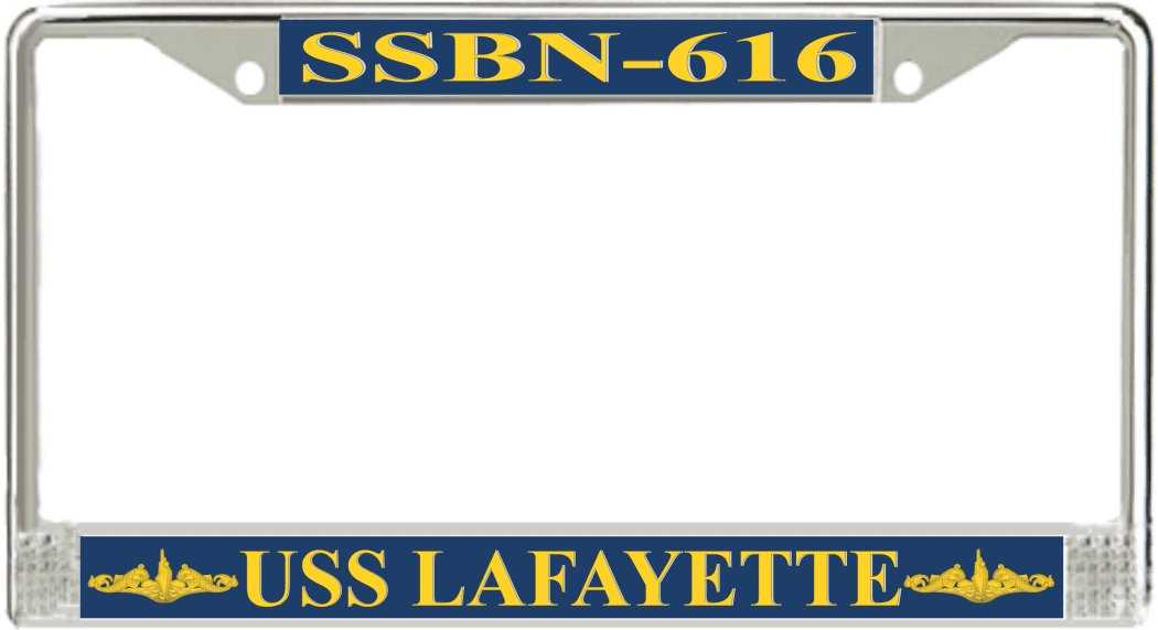 USS Lafayette  SSBN-616 License Plate Frame This USS Lafayette SSBN-616 License Plate Frame is proudly made in the USA at our facilities in Scottsboro, Alabama. Each Frame features top and bottom sublimated design strips that are poly coated for a protective gloss finish. Please check your state and local regulations for compatibility of these frames for use on your vehicle.