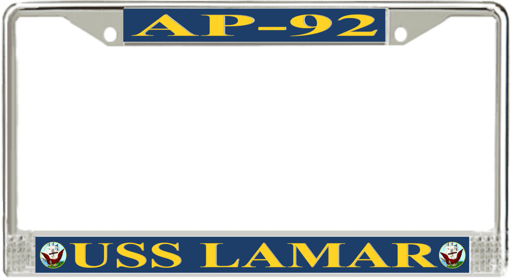 USS Lamar AP-92 License Plate FrameThis USS Lamar AP-92 License Plate Frame is proudly made in the USA at our facilities in Scottsboro, Alabama. Each of our MilitaryBest U.S. Navy Frames feature top and bottom Poly Coated Aluminum strips that are printed using sublimation which gives these quality automobile military frames a beautiful high gloss finish.