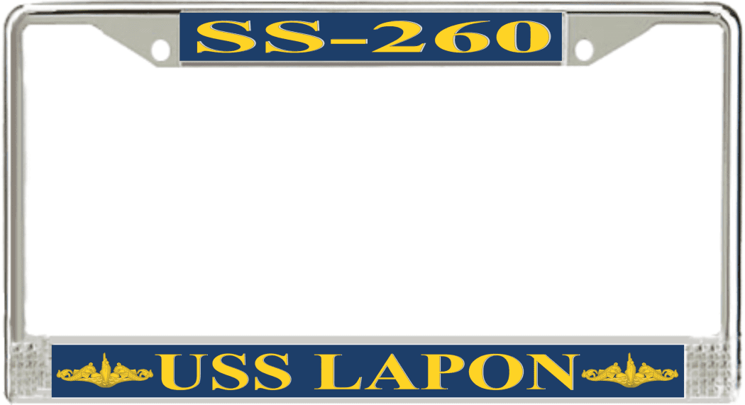 USS Lapon SS-260 License Plate Frame This USS Lapon SS-260 License Plate Frame is proudly made in the USA at our facilities in Scottsboro, Alabama. Each Frame features top and bottom sublimated design strips that are poly coated for a protective gloss finish. Please check your state and local regulations for compatibility of these frames for use on your vehicle.