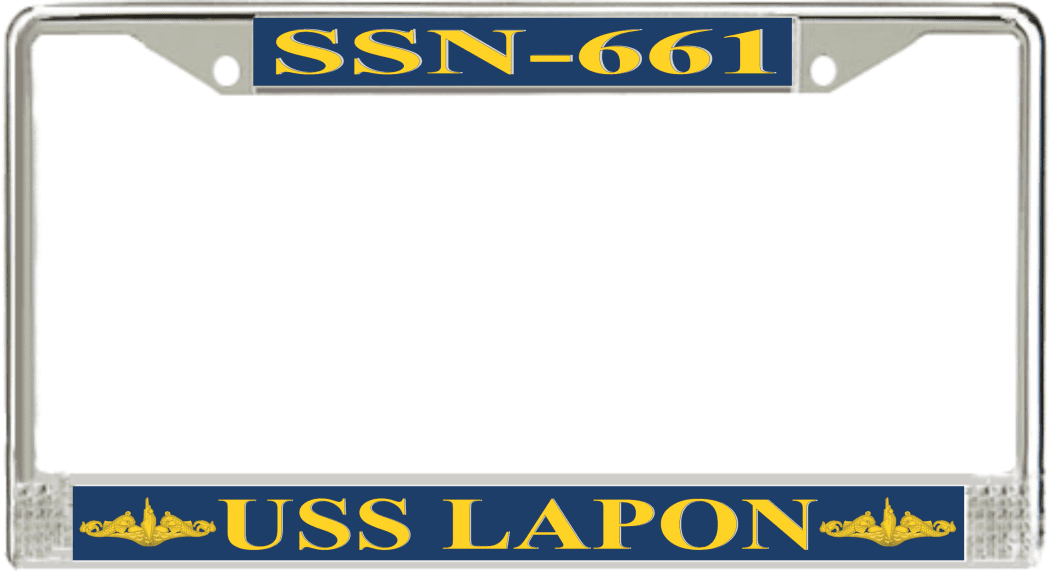 USS Lapon SSN-661 License Plate Frame This USS Lapon SSN-661 License Plate Frame is proudly made in the USA at our facilities in Scottsboro, Alabama. Each Frame features top and bottom sublimated design strips that are poly coated for a protective gloss finish. Please check your state and local regulations for compatibility of these frames for use on your vehicle.