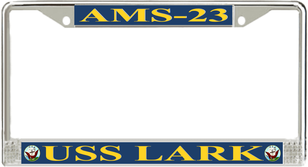 USS Lark AMS-23 License Plate Frame This USS Lark AMS-23 License Plate Frame is proudly made in the USA at our facilities in Scottsboro, Alabama. Each Frame features top and bottom sublimated design strips that are poly coated for a protective gloss finish. Please check your state and local regulations for compatibility of these frames for use on your vehicle.