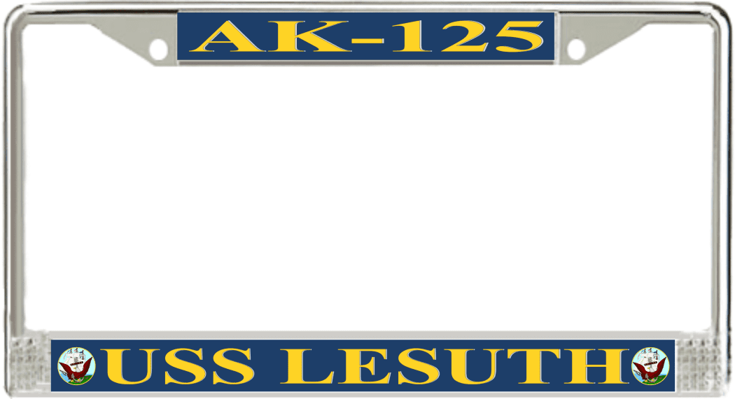 USS Lesuth AK-125 License Plate FrameThis USS Lesuth AK-125 License Plate Frame is proudly made in the USA at our facilities in Scottsboro, Alabama. Each of our MilitaryBest U.S. Navy Frames feature top and bottom Poly Coated Aluminum strips that are printed using sublimation which gives these quality automobile military frames a beautiful high gloss finish.