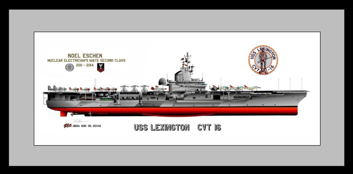 MilitaryBest is proud to offer this wonderful U.S. Navy Art Print from George Bieada's collection of fine Naval Vessel Drawings.This USS Lexington CVT-16 Color Print is offered as a one of a kind personalized print that will include your Name, Rank, Rate and Years of Service as well as your Squadron, if desired.