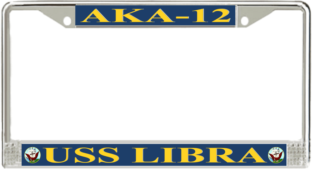 USS Libra AKA-12 License Plate FrameThis USS Libra AKA-12 License Plate Frame is proudly made in the USA at our facilities in Scottsboro, Alabama. Each of our MilitaryBest U.S. Navy Frames feature top and bottom Poly Coated Aluminum strips that are printed using sublimation which gives these quality automobile military frames a beautiful high gloss finish.