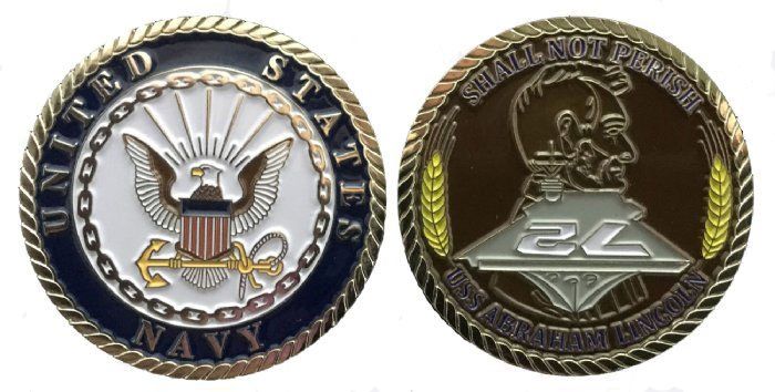 This USS Lincoln Challenge Coin Enlisted measures 1-3/4 inches and is made from a bronze alloy with a brilliantly colored nickel finish. This Challenge Coin would make a wonderful addition to your collection or a great gift. Its quality is guaranteed.Does NOT Fit in Acrylic Single 1 5/8" Challenge Coin Display Case