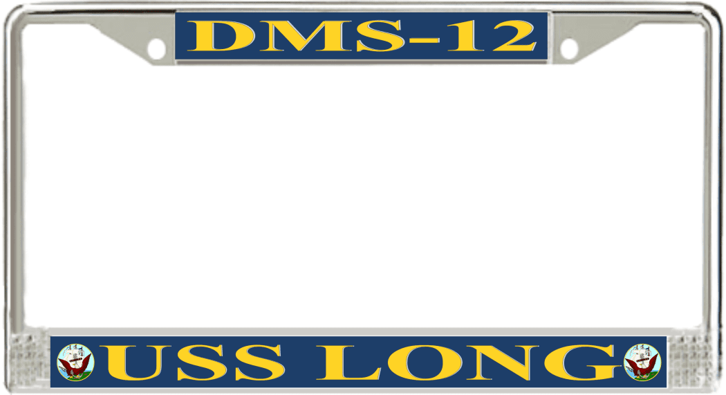 USS Long DMS-12 License Plate FrameThis USS Long DMS-12 License Plate Frame is proudly made in the USA at our facilities in Scottsboro, Alabama. Each of our MilitaryBest U.S. Navy Frames feature top and bottom Poly Coated Aluminum strips that are printed using sublimation which gives these quality automobile military frames a beautiful high gloss finish.