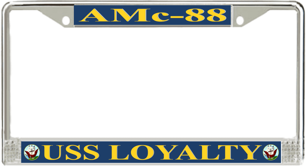 USS Loyalty AMc-88 License Plate FrameThis USS Loyalty AMc-88 License Plate Frame is proudly made in the USA at our facilities in Scottsboro, Alabama. Each of our MilitaryBest U.S. Navy Frames feature top and bottom Poly Coated Aluminum strips that are printed using sublimation which gives these quality automobile military frames a beautiful high gloss finish.