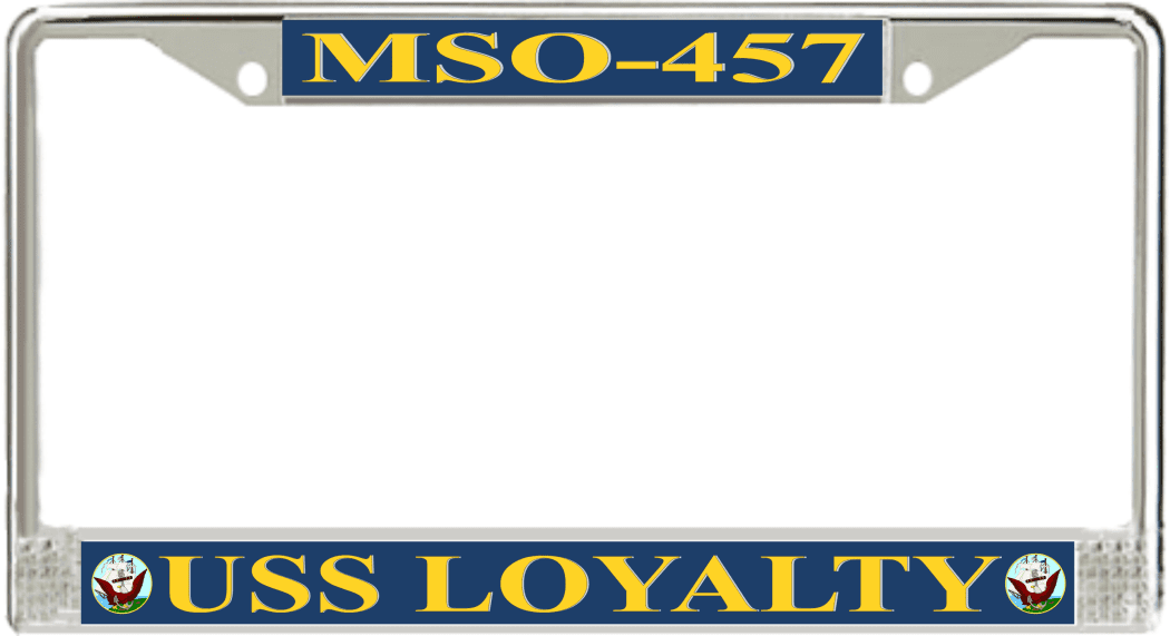 USS Loyalty MSO-457 License Plate FrameThis USS Loyalty MSO-457 License Plate Frame is proudly made in the USA at our facilities in Scottsboro, Alabama. Each of our MilitaryBest U.S. Navy Frames feature top and bottom Poly Coated Aluminum strips that are printed using sublimation which gives these quality automobile military frames a beautiful high gloss finish.