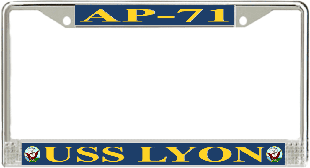 USS Lyon AP-71 License Plate FrameThis USS Lyon AP-71 License Plate Frame is proudly made in the USA at our facilities in Scottsboro, Alabama. Each of our MilitaryBest U.S. Navy Frames feature top and bottom Poly Coated Aluminum strips that are printed using sublimation which gives these quality automobile military frames a beautiful high gloss finish.