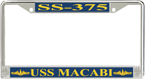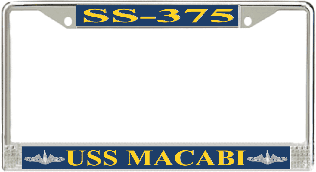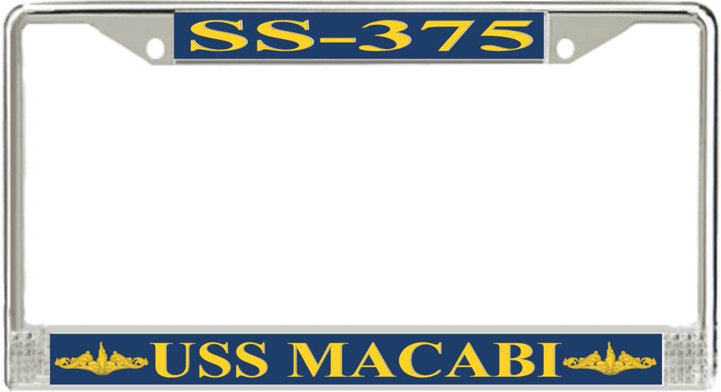 USS Macabi SS-375 License Plate Frame This USS Macabi SS-375 License Plate Frame is proudly made in the USA at our facilities in Scottsboro, Alabama. Each Frame features top and bottom sublimated design strips that are poly coated for a protective gloss finish. Please check your state and local regulations for compatibility of these frames for use on your vehicle.