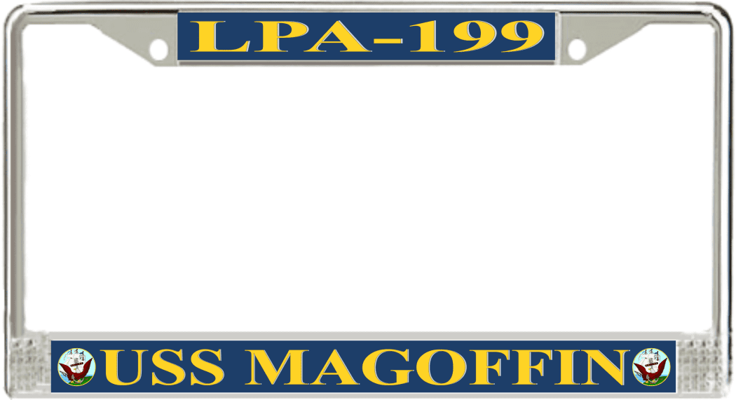 USS Magoffin LPA-199 License Plate frameThis USS Magoffin LPA-199 License Plate frame is proudly made in the USA at our facilities in Scottsboro, Alabama. Each of our MilitaryBest U.S. Navy Frames feature top and bottom Poly Coated Aluminum strips that are printed using sublimation which gives these quality automobile military frames a beautiful high gloss finish.