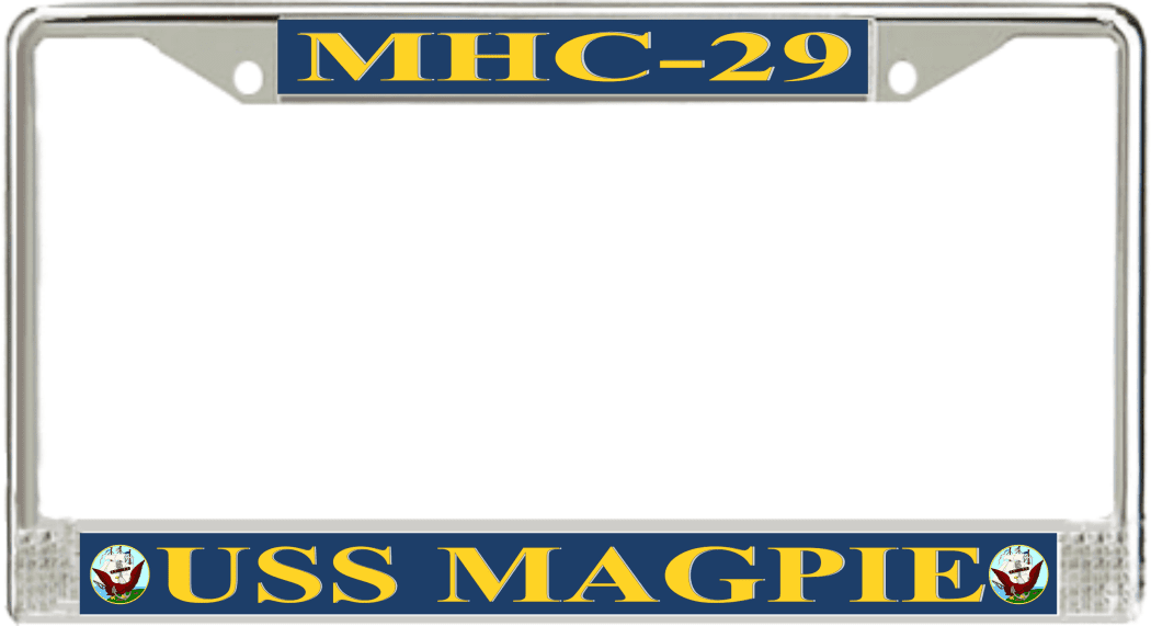 USS Magpie MHC-29 License Plate FrameThis USS Magpie MHC-29 License Plate Frame is proudly made in the USA at our facilities in Scottsboro, Alabama. Each of our MilitaryBest U.S. Navy Frames feature top and bottom Poly Coated Aluminum strips that are printed using sublimation which gives these quality automobile military frames a beautiful high gloss finish.