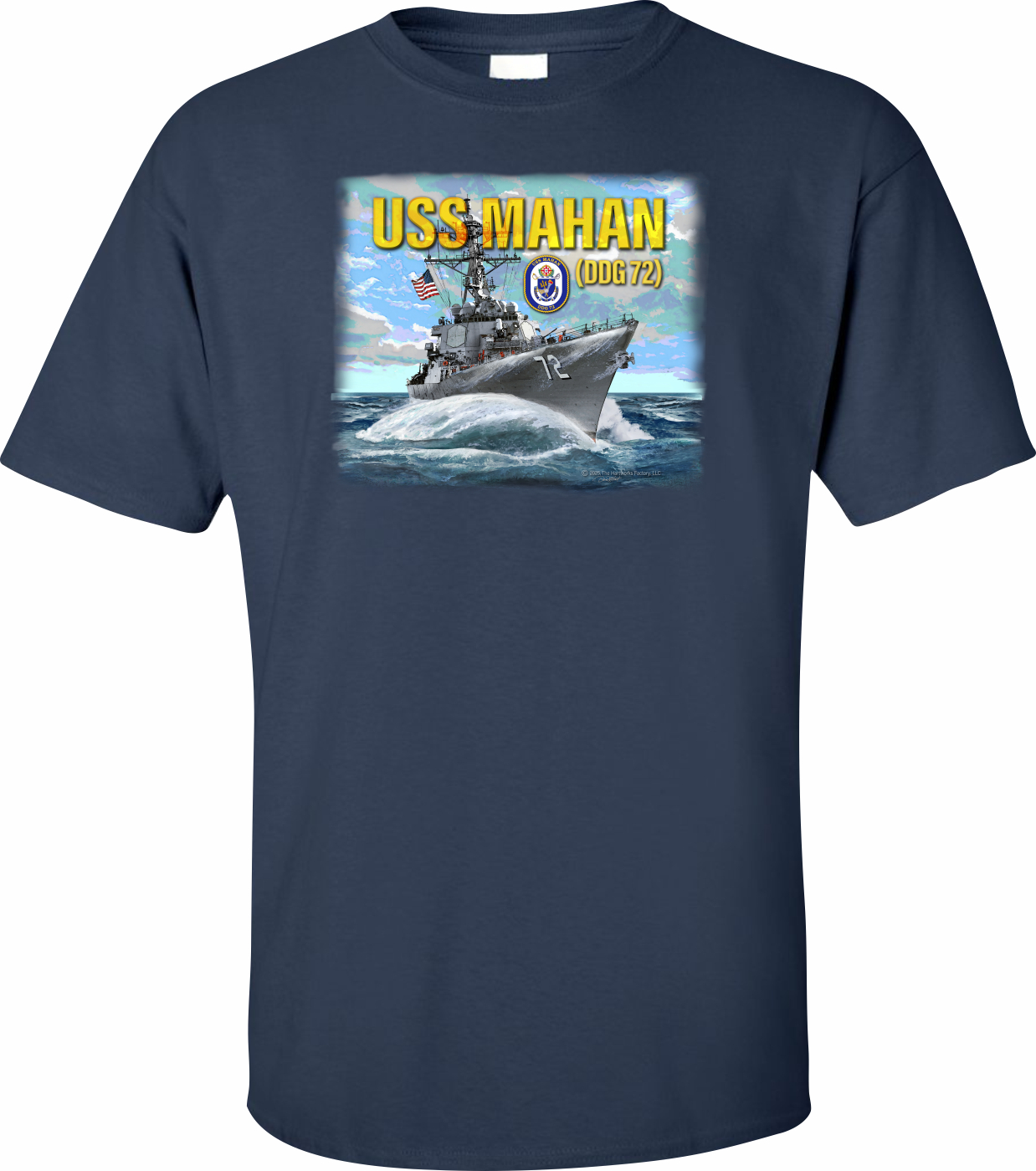 MilitaryBest is proud to offer this fine USS Mahan DDG-72 Printed Art T-Shirt. This shirt features a full front print, with beautiful artwork designed by licensed Navy artist David Hart. This shirt is available in black and navy blue colors. Each T-shirt is proudly printed in the USA.Unless there is a defect in workmanship or material, these shirts are unreturnable.