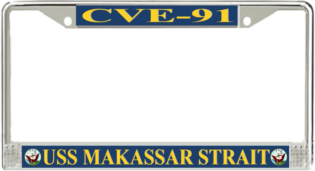 USS Makassar Strait CVE-91 License Plate Frame This USS Makassar Strait CVE-91 License Plate Frame is proudly made in the USA at our facilities in Scottsboro, Alabama. Each Frame features top and bottom sublimated design strips that are poly coated for a protective gloss finish.