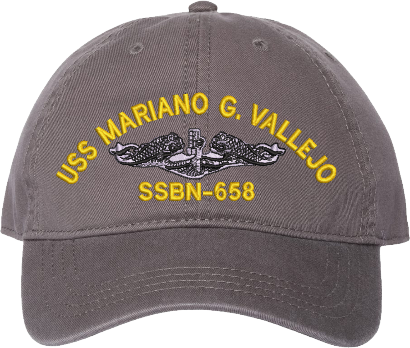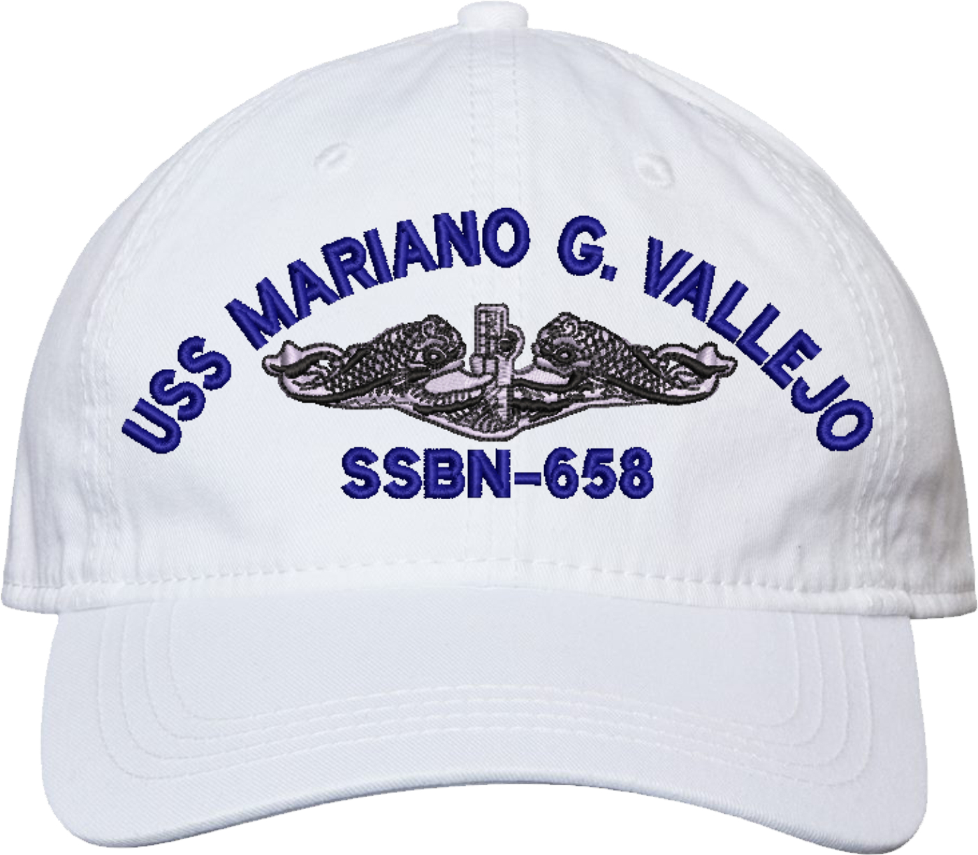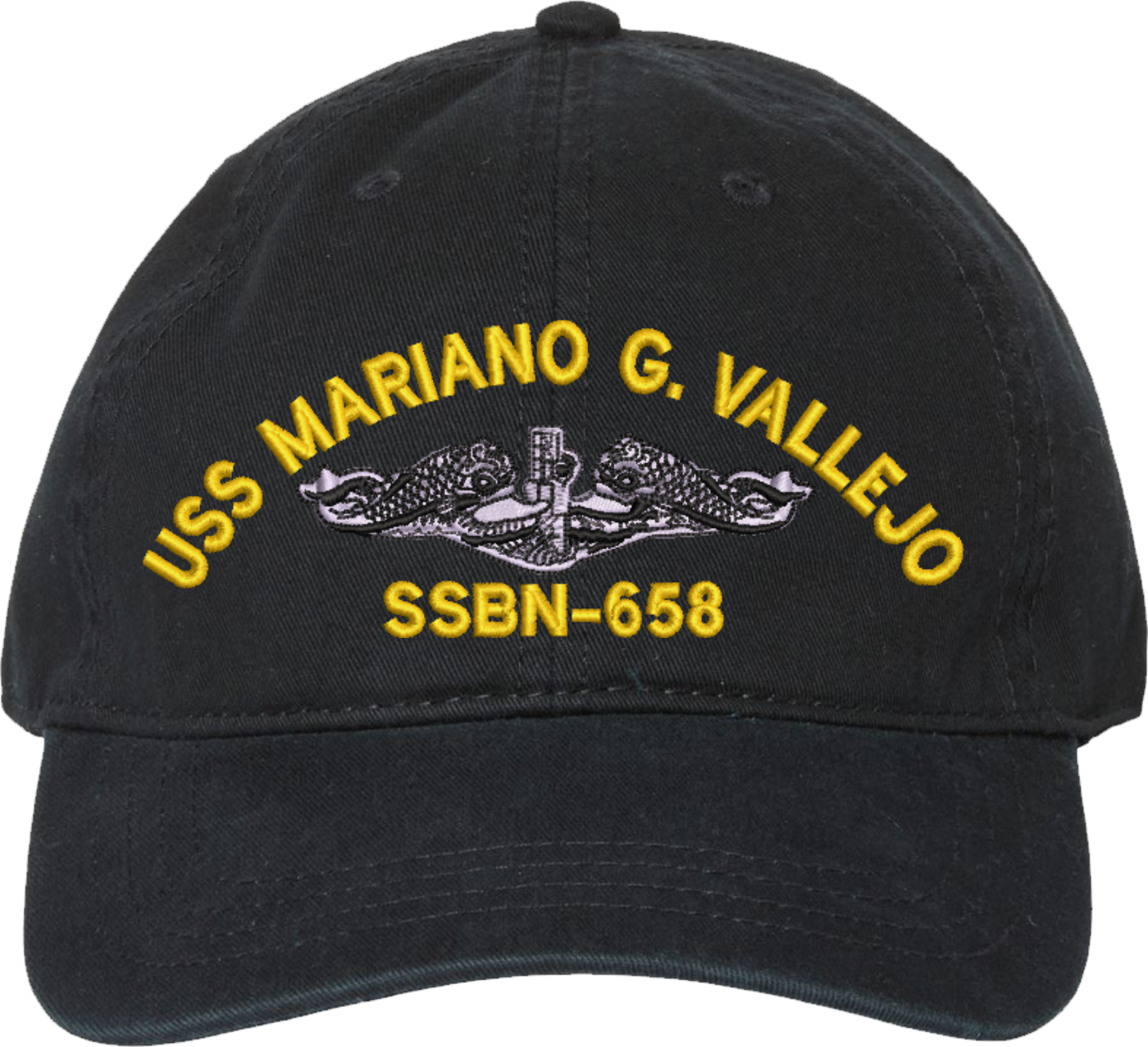 Show your Navy pride with this USS Mariano G Vallejo SSBN-658 with Dolphins Unstructured Dad Cap from MilitaryBest. Crafted from 100% washed chino twill cotton, this six-panel, low-profile cap offers a relaxed and comfortable fit. Featuring high-quality embroidery done in our Scottsboro, Alabama facility, this cap is designed with a pre-curved visor and an adjustable tri-glide buckle closure for a perfect fit. Whether for everyday wear or as a meaningful gift, this cap is a great way to honor your own or a loved one's service.For caps ordered with custom embroidered personalized text please allow an additional 3 to 5 days production time. All custom back text will be embroidered in ALL CAPITAL LETTERS. Caps with back text or eggs are non-returnable unless there is a material defect in the cap.