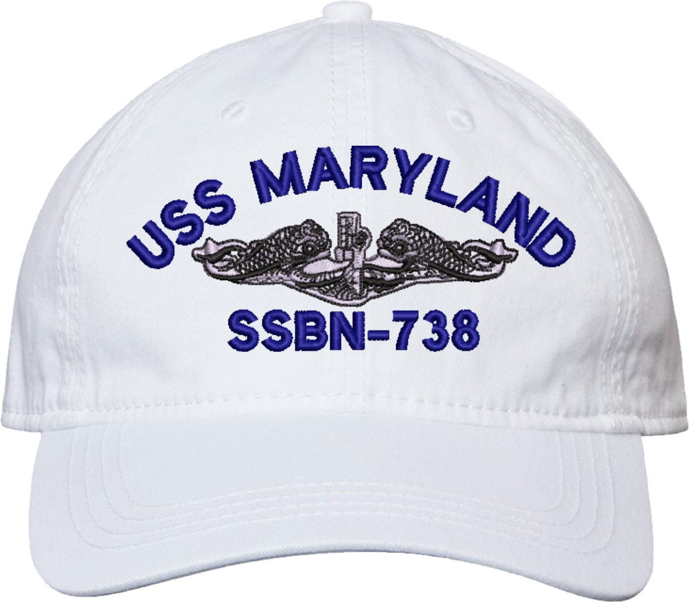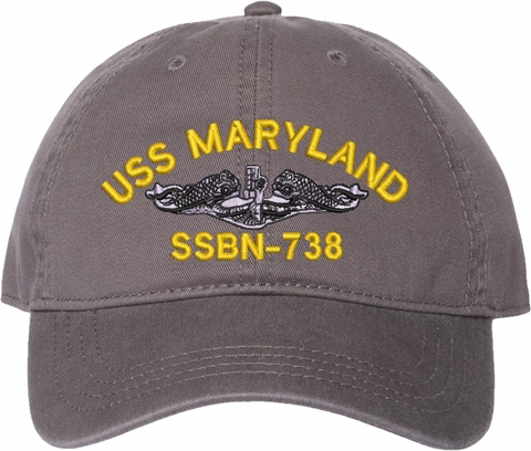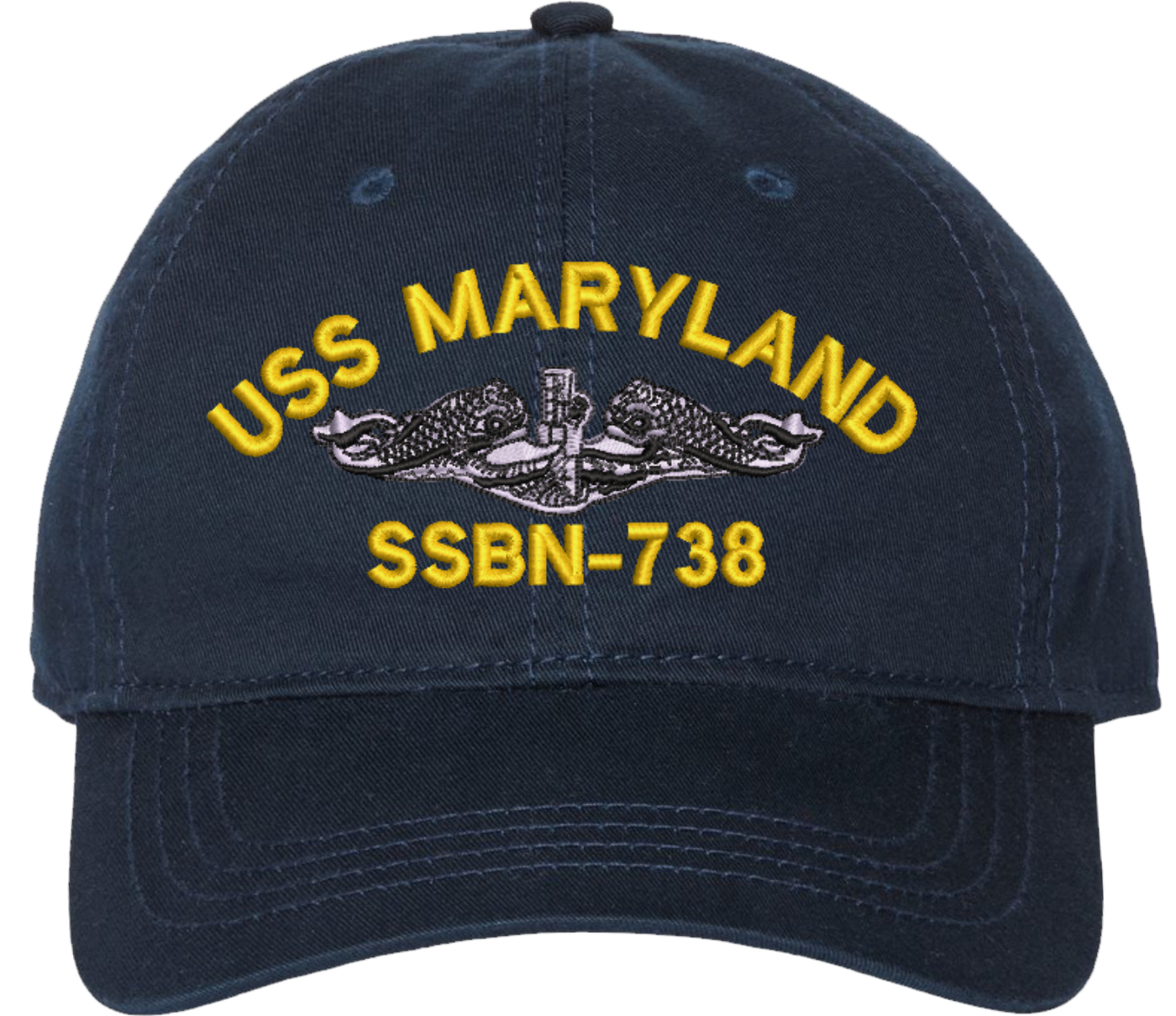 Show your Navy pride with this USS Maryland SSBN-738 with Dolphins Unstructured Dad Cap from MilitaryBest. Crafted from 100% washed chino twill cotton, this six-panel, low-profile cap offers a relaxed and comfortable fit. Featuring high-quality embroidery done in our Scottsboro, Alabama facility, this cap is designed with a pre-curved visor and an adjustable tri-glide buckle closure for a perfect fit. Whether for everyday wear or as a meaningful gift, this cap is a great way to honor your own or a loved one's service.For caps ordered with custom embroidered personalized text please allow an additional 3 to 5 days production time. All custom back text will be embroidered in ALL CAPITAL LETTERS. Caps with back text or eggs are non-returnable unless there is a material defect in the cap.