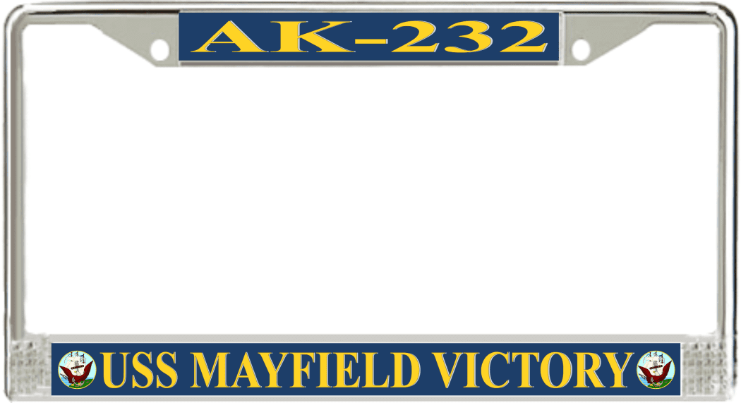 USS Mayfield Victory AK-232 License Plate FrameThis USS Mayfield Victory AK-232 License Plate Frame is proudly made in the USA at our facilities in Scottsboro, Alabama. Each of our MilitaryBest U.S. Navy Frames feature top and bottom Poly Coated Aluminum strips that are printed using sublimation which gives these quality automobile military frames a beautiful high gloss finish.