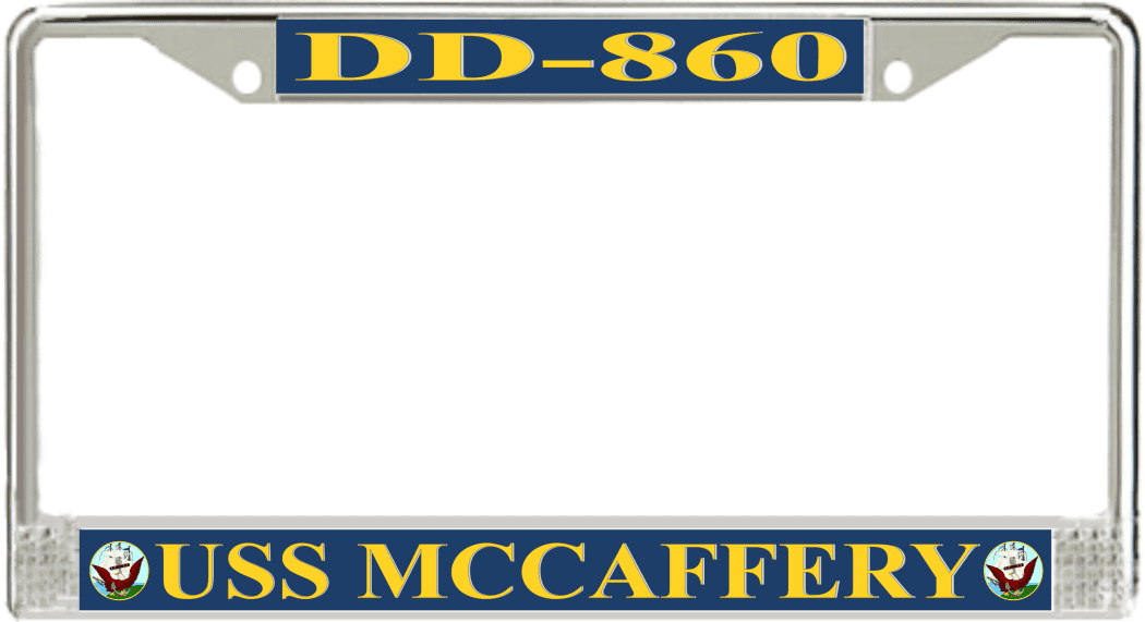 USS McCaffery DD-860 License Plate FrameThis USS McCaffery DD-860 License Plate Frame is proudly made in the USA at our facilities in Scottsboro, Alabama. Each of our MilitaryBest U.S. Navy Frames feature top and bottom Poly Coated Aluminum strips that are printed using sublimation which gives these quality automobile military frames a beautiful high gloss finish.