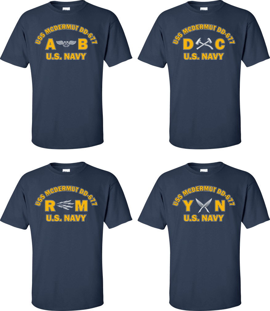 Due to disruptions in supply chains, this design will be embroidered on a Champion, Gildan, Jerzees or comparable brand.Proudly display your ship and rate with our top quality USS MCDERMUT DD-677 Rates t-shirts, sweatshirts, and hoodies. These fine U.S. Navy apparel items will make you the envy of your veteran buddies, or will make a fine gift! Our USS MCDERMUT DD-677 shirts are proudly printed in the USA!
