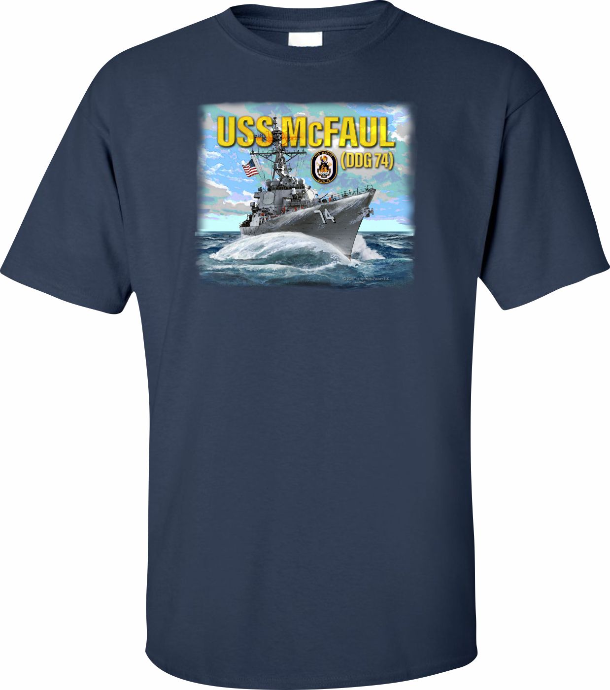 MilitaryBest is proud to offer this fine USS McFaul DDG-74 Printed Art T-Shirt. This shirt features a full front print, with beautiful artwork designed by licensed Navy artist David Hart. This shirt is available in black and navy blue colors. Each T-shirt is proudly printed in the USA.Unless there is a defect in workmanship or material, these shirts are unreturnable.
