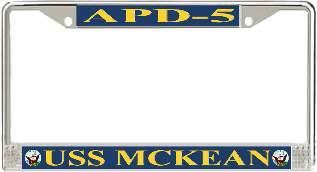 USS McKean APD-5 License Plate FrameThis USS McKean APD-5 License Plate Frame is proudly made in the USA at our facilities in Scottsboro, Alabama. Each of our MilitaryBest U.S. Navy Frames feature top and bottom Poly Coated Aluminum strips that are printed using sublimation which gives these quality automobile military frames a beautiful high gloss finish.