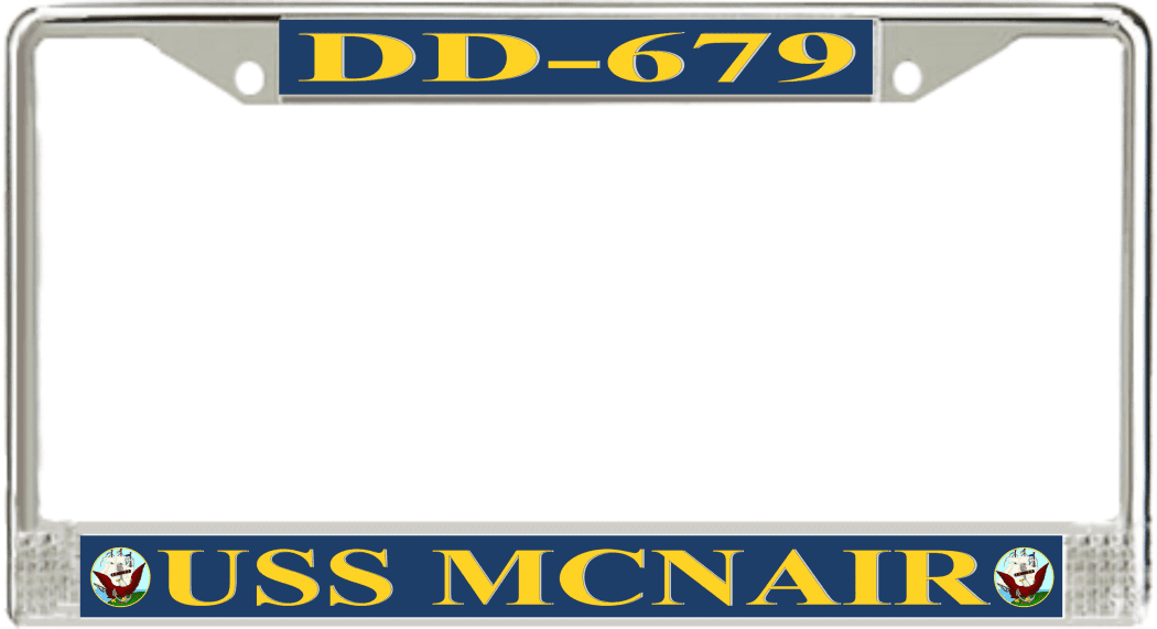 USS McNair DD-679 License Plate FrameThis USS McNair DD-679 License Plate Frame is proudly made in the USA at our facilities in Scottsboro, Alabama. Each of our MilitaryBest U.S. Navy Frames feature top and bottom Poly Coated Aluminum strips that are printed using sublimation which gives these quality automobile military frames a beautiful high gloss finish.