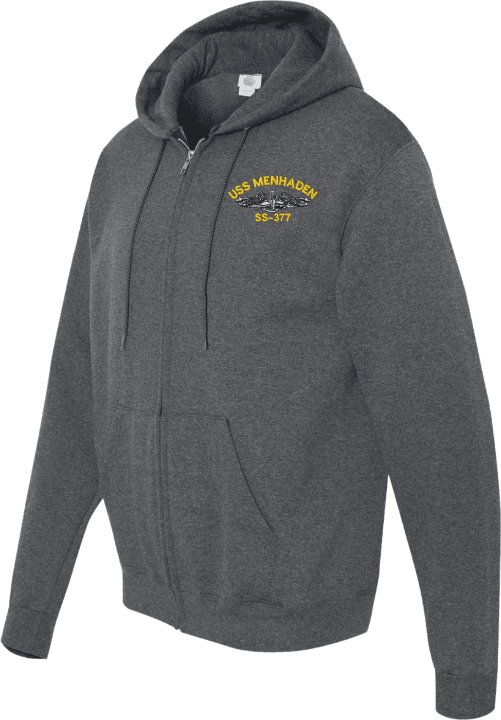 MilitaryBest has expanded its line of apparel with this custom embroidered USS Menhaden SS-377 with Dolphins Embroidered Zippered Hoodie. Each Hoodie is direct embroidered onto a Champion brand 9.5 oz 50/50 Cotton Poly blend. This will make an excellent addition to your wardrobe, or a great gift. Your satisfaction is Guaranteed! These quality zippered hoodies are proudly embroidered at our facilities in Scottsboro, AL. Support the Army MWR program by purchasing only from Licensed Vendors.