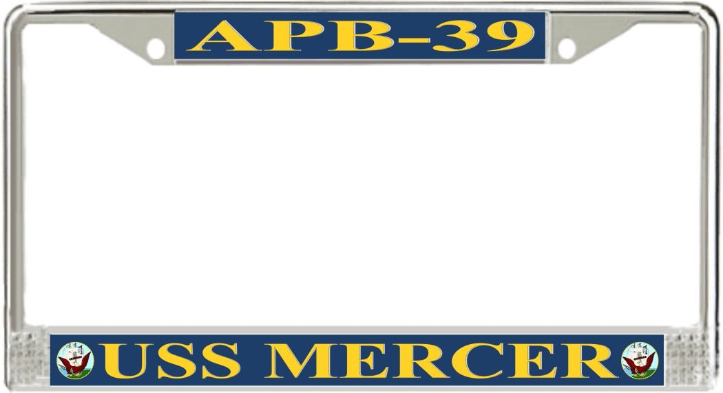 USS Mercer APB-39 License Plate FrameThis USS Mercer APB-39 License Plate Frame is proudly made in the USA at our facilities in Scottsboro, Alabama. Each of our MilitaryBest U.S. Navy Frames feature top and bottom Poly Coated Aluminum strips that are printed using sublimation which gives these quality automobile military frames a beautiful high gloss finish.