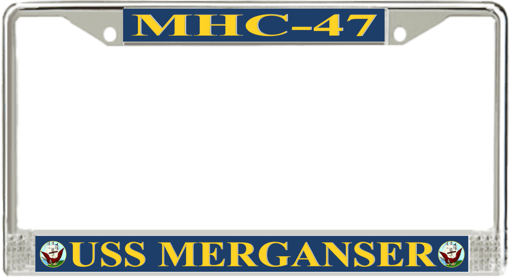 USS Merganser MHC-47 License Plate FrameThis USS Merganser MHC-47 License Plate Frame is proudly made in the USA at our facilities in Scottsboro, Alabama. Each of our MilitaryBest U.S. Navy Frames feature top and bottom Poly Coated Aluminum strips that are printed using sublimation which gives these quality automobile military frames a beautiful high gloss finish.