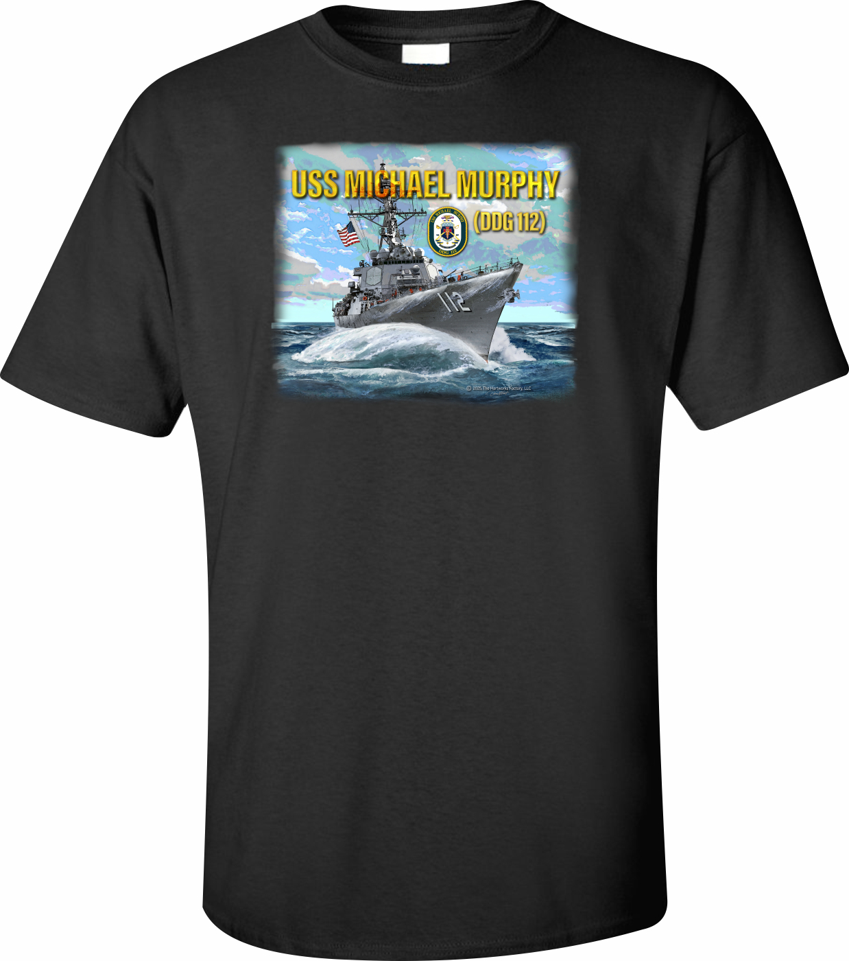 MilitaryBest is proud to offer this fine USS Michael Murphy DDG-112 Printed Art T-Shirt. This shirt features a full front print, with beautiful artwork designed by licensed Navy artist David Hart. This shirt is available in black and navy blue colors. Each T-shirt is proudly printed in the USA.Unless there is a defect in workmanship or material, these shirts are unreturnable.