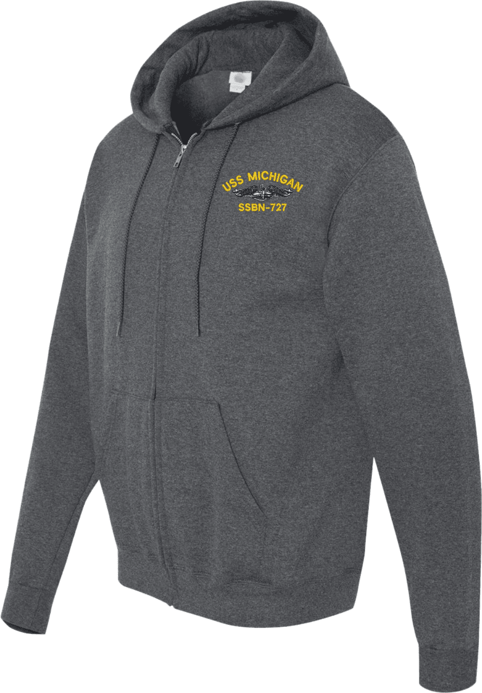 MilitaryBest has expanded its line of apparel with this custom embroidered USS Michigan SSBN-727 with Dolphins Embroidered Zippered Hoodie. Each Hoodie is direct embroidered onto a Champion brand 9.5 oz 50/50 Cotton Poly blend. This will make an excellent addition to your wardrobe, or a great gift. Your satisfaction is Guaranteed! These quality zippered hoodies are proudly embroidered at our facilities in Scottsboro, AL. Support the Army MWR program by purchasing only from Licensed Vendors.