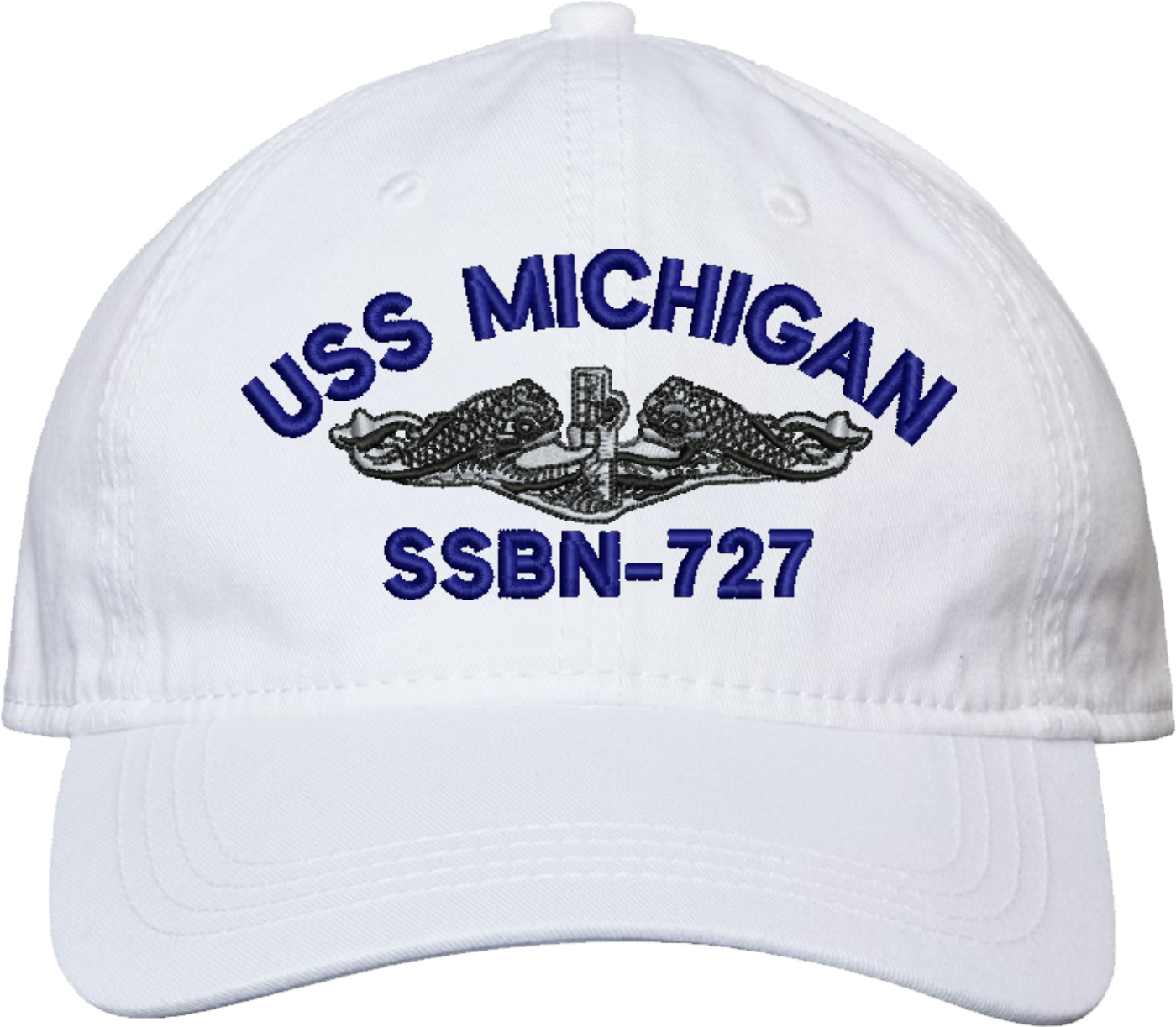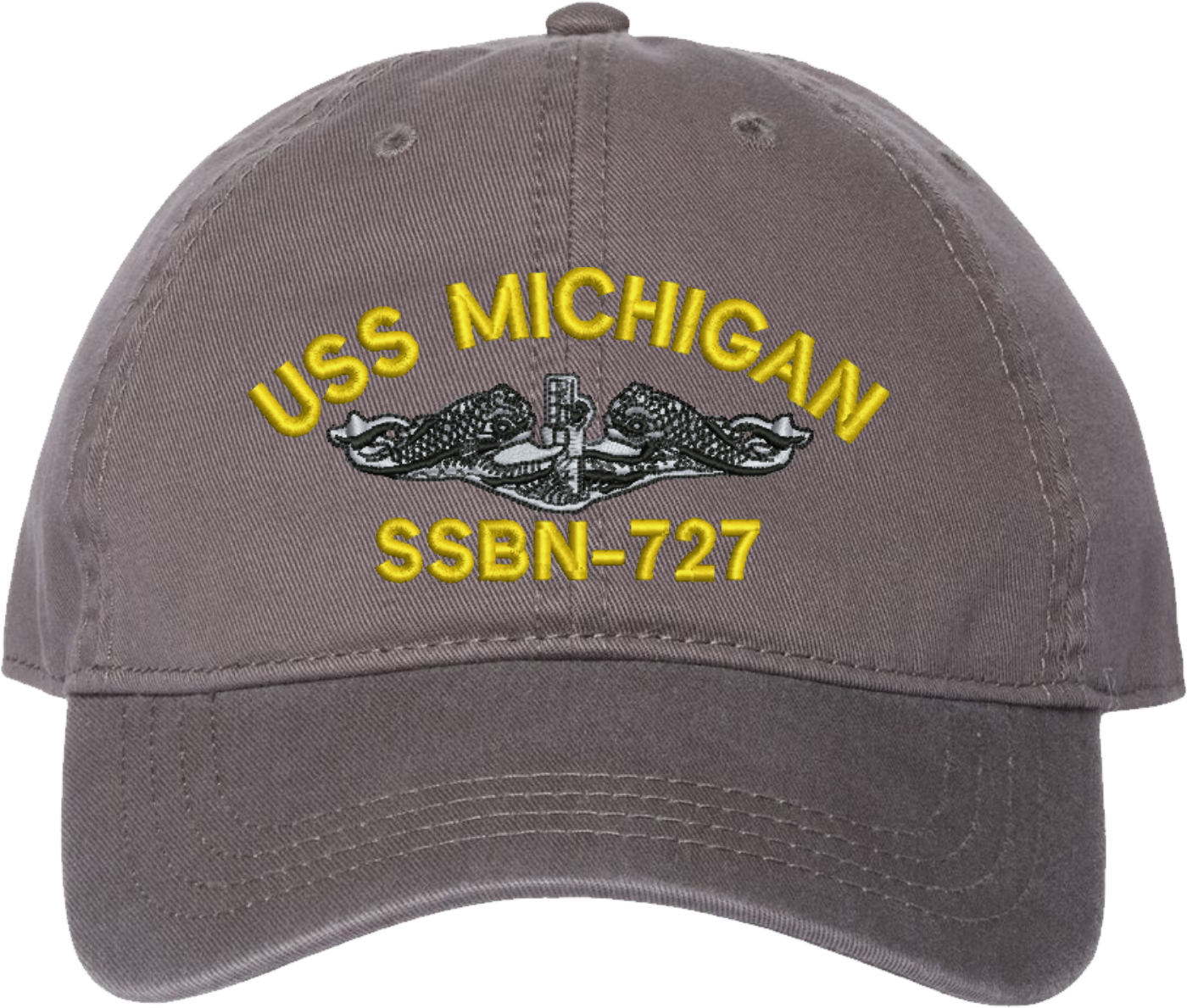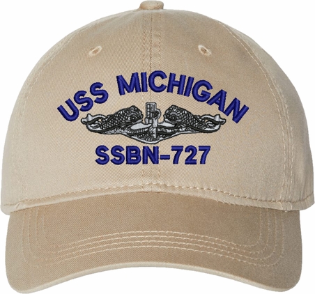 Show your Navy pride with this USS Michigan SSBN-727 with Dolphins Unstructured Dad Cap from MilitaryBest. Crafted from 100% washed chino twill cotton, this six-panel, low-profile cap offers a relaxed and comfortable fit. Featuring high-quality embroidery done in our Scottsboro, Alabama facility, this cap is designed with a pre-curved visor and an adjustable tri-glide buckle closure for a perfect fit. Whether for everyday wear or as a meaningful gift, this cap is a great way to honor your own or a loved one's service.For caps ordered with custom embroidered personalized text please allow an additional 3 to 5 days production time. All custom back text will be embroidered in ALL CAPITAL LETTERS. Caps with back text or eggs are non-returnable unless there is a material defect in the cap.