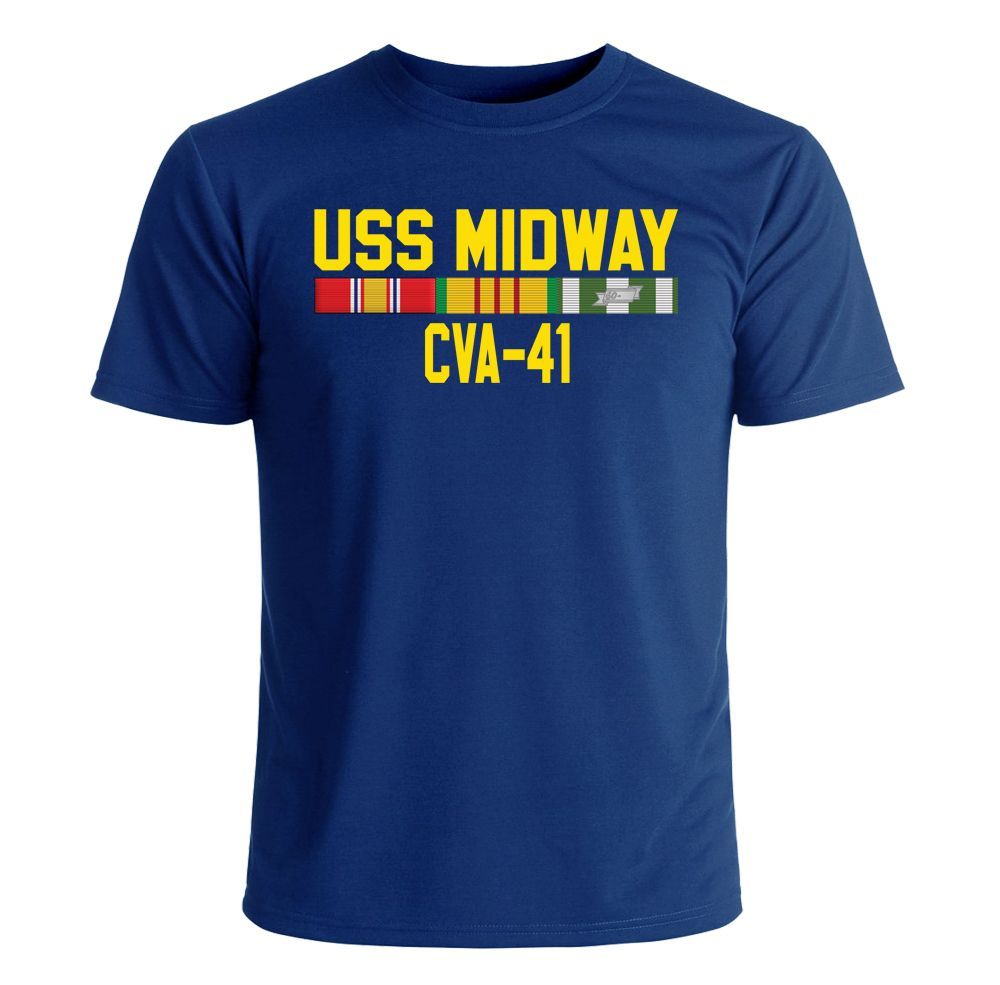 MilitaryBest is proud to offer this U.S. Navy Ship Vietnam Printed T-Shirt. Each design is offered on a Navy Blue T-Shirt. This USS Midway CVA-41 With Vietnam Service Ribbons T-Shirt is proudly printed in the USA. The quality of all of our Military products is guaranteed. Unless there is a defect in workmanship or material, this shirt is unreturnable.A percentage of the sale of each MilitaryBest item is forwarded to the licensing departments of each respective branch of service in support of the MWR (Morale, Welfare, & Recreation) program. These payments are made by either ALL4U LLC or the wholesaler from where the item originated. Our team thanks you for your service and your support of these programs.