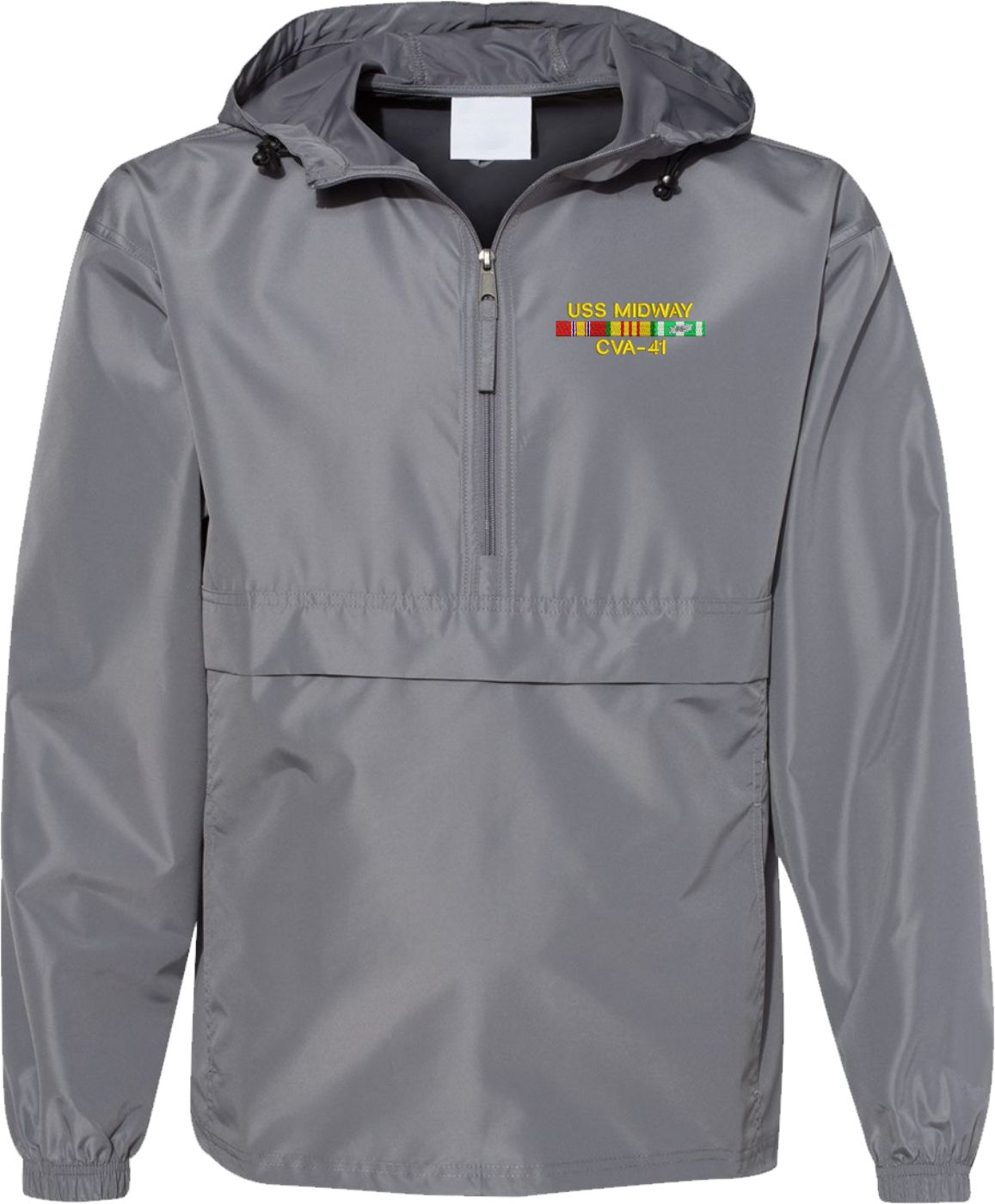MilitaryBest is proud to offer this quality USS Midway CVA-41 with Vietnam Service Ribbons Hooded Windbreaker. Also known as an Anorak Jacket, this windbreaker is designed to keep wind and water out. With a design embroidered over the left chest, this windbreaker is embroidered to order at our facilities in Scottsboro, AL.. This windbreaker can be packed into the mesh lined pouch pocket for a more portable method of storage.- 100% Polyester